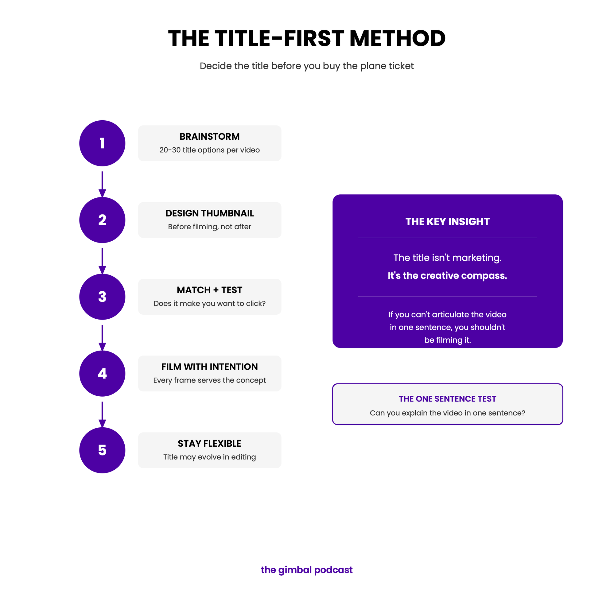 - Generate titles before you plan logistics. Write 20+ title options for your next video. If none of them excite you, the idea isn't ready.