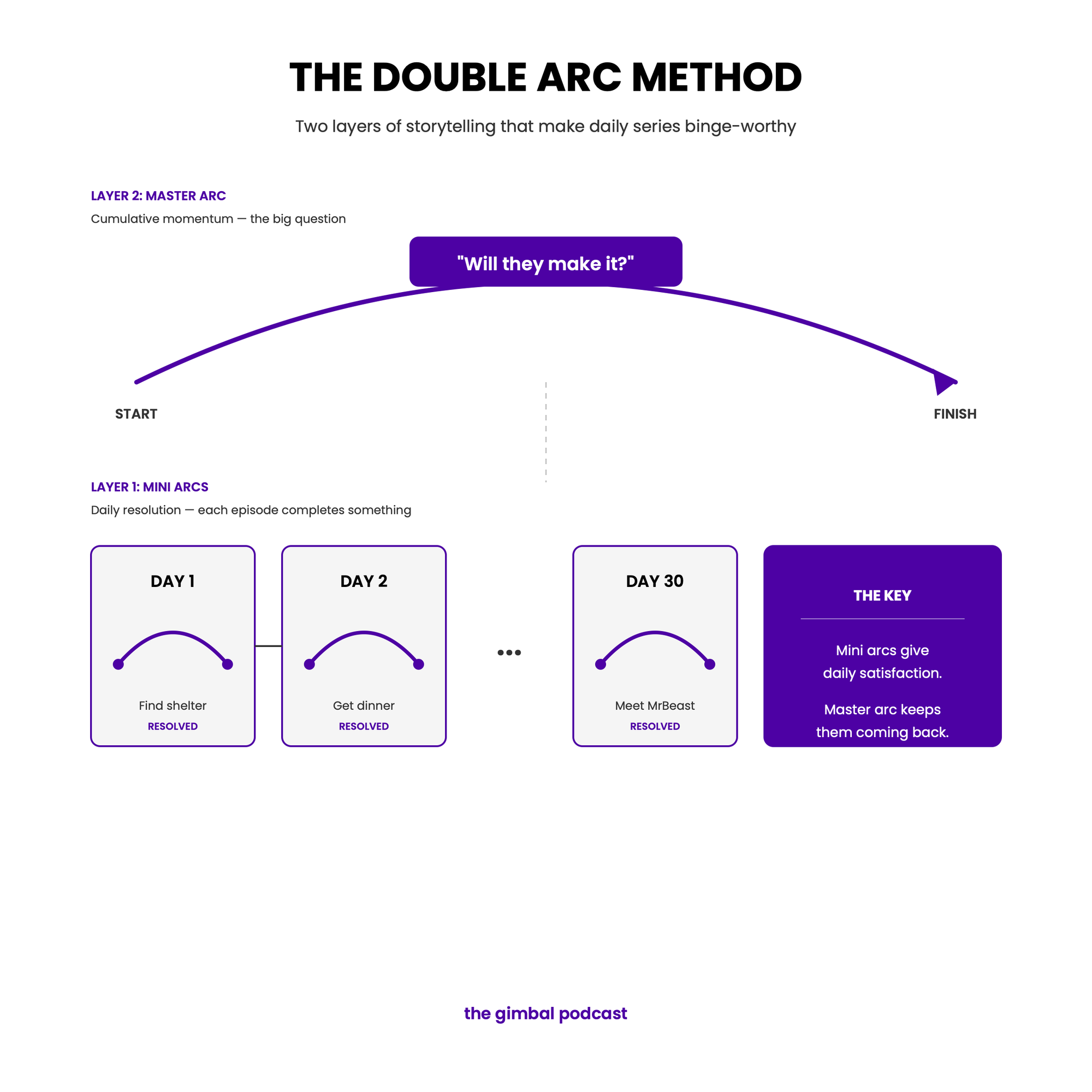Why it works: Humans want closure. The mini arc gives it daily. The master arc keeps them coming back.
