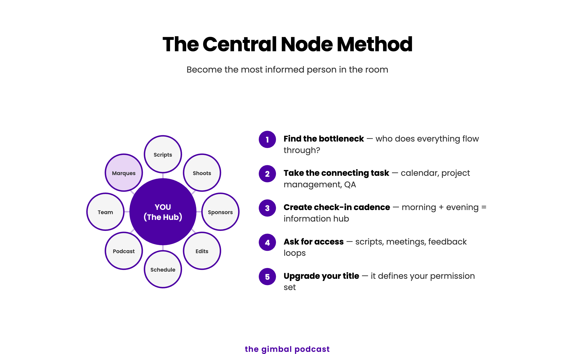 Access compounds. The more she asked for access (scripts, rooms, feedback loops), the more she got. She eventually asked to change her title from "Main Channel Producer" to "Head of Production", a request that changed her entire scope.